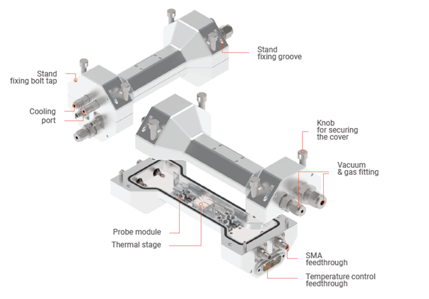 ピエゾモジュール搭載マイクロプローブシステム Piezo Module Micro Probe System (PZMPS) ピエゾ駆動機構により、温度・真空・ガスなどの制御環境下において外部から高精度な位置決めが可能なプローブシステムです。