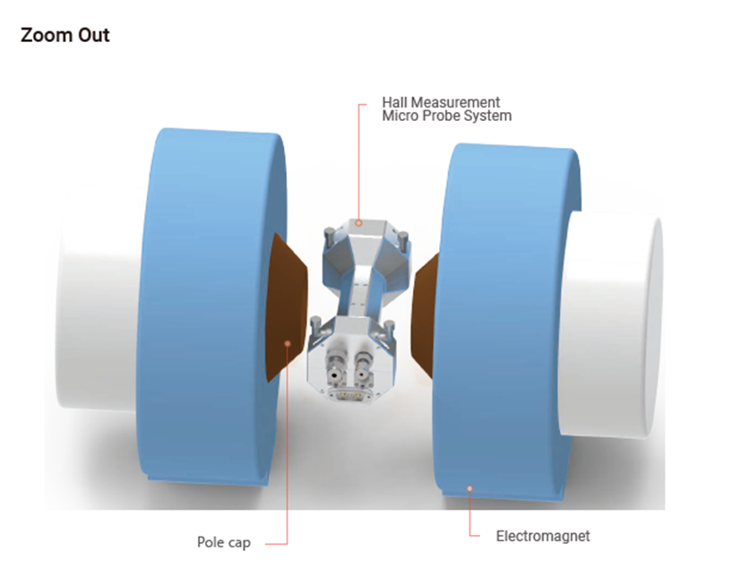 ホール測定用マイクロプローブシステム Hall Measurement Micro Probe System (HMMPS) ホール測定用マイクロプローブシステムは、従来型電磁石との組み合わせを前提に設計されており、電気伝導測定、特にホール効果測定に適したプローブシステムです。本システムは、NEXTRON の環境制御装置と互換性があり、温度、真空、湿度、ガス雰囲気を含む包括的な環境制御が可能です。さらに、NEXTRON独自の四端子プローブ構成を備えており、磁場下その場測定などの高度な磁気実験に対応し、制御された環境下で高精度な測定および解析を実現します。 |