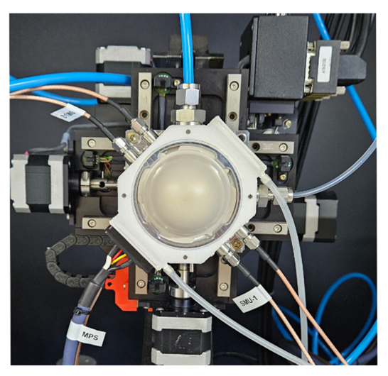 特殊チャンバXRDマイクロプローブシステム(XRD装置搭載用プローブ付き環境制御システム) XRD Micro Probe System (Environment System with Probes for Mounting XRD Machine) XRDマイクロプローブシステムは、高温・高真空環境下においてその場XRD測定を可能にするプローブステーションです。 NEXTRON独自の手動プローブにより、試料への電圧印加および電流測定が可能です。